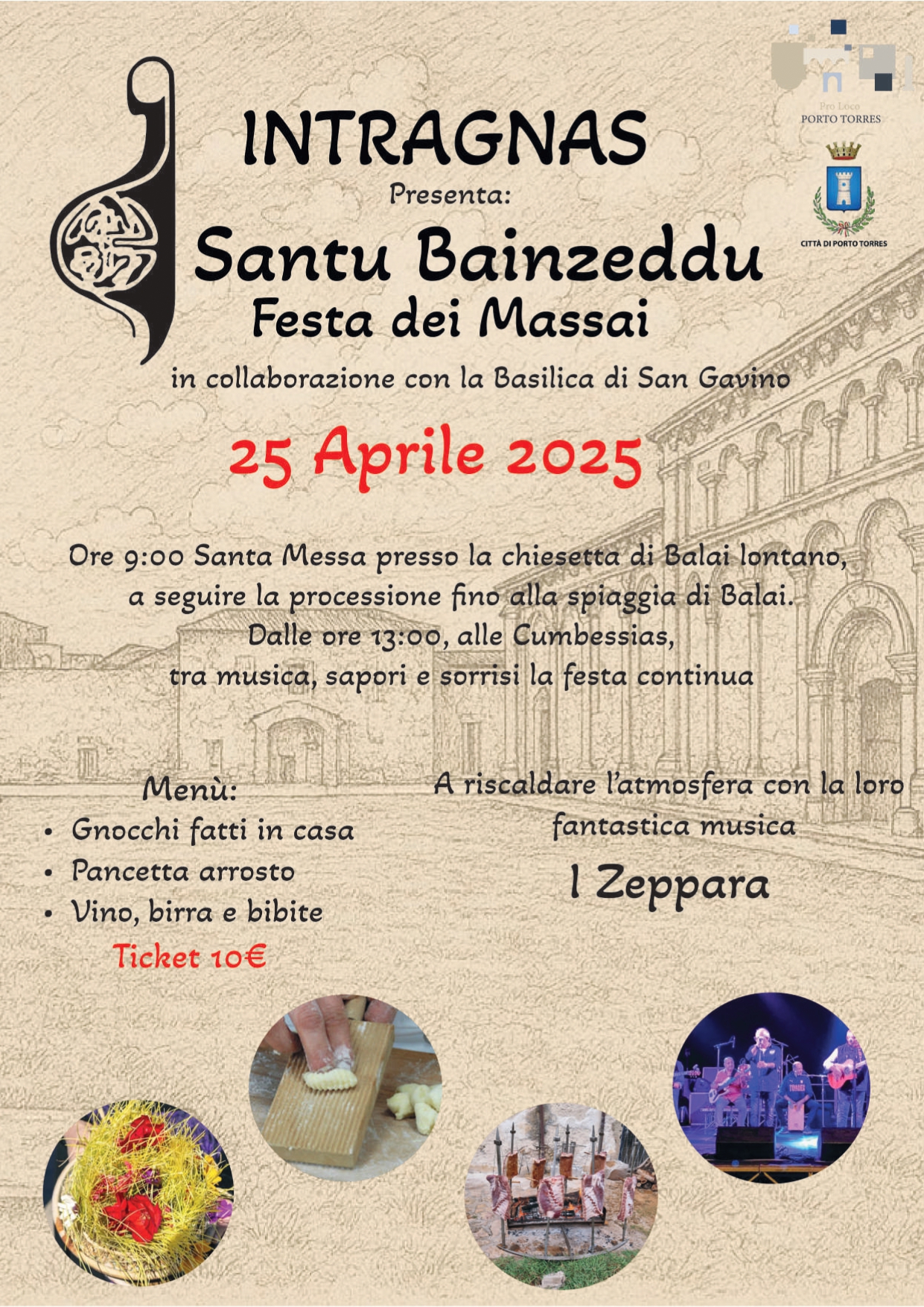 In onore della festa di Santu Bainzeddu festa dei massai, l’associazione Intragnas con la collaborazione della Basilica di San Gavino organizza dalle ore 13:00 presso le Cumbessias di San Gavino, un pranzo tra musica sapori e sorrisi per continuare la festa. Il menù prevede gnocchi fatti in casa e pancetta arrosto, a riscaldare l’atmosfera con la loro fantastica musica saranno presenti i Zeppara.