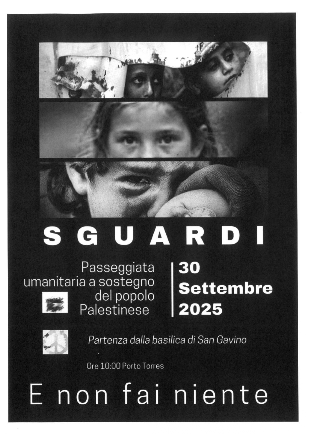 L’amministrazione comunale attraverso la concessione del patrocinio supporta la manifestazione pacifica di sensibilizzazione e sostegno verso il popolo Palestinese “Sguardi”, organizzata dall’associazione umanitaria spontanea di cittadini di Porto Torres, in programma martedì 30 settembre con partenza alle ore 10.00 dal piazzale dalla Basilica di San Gavino
