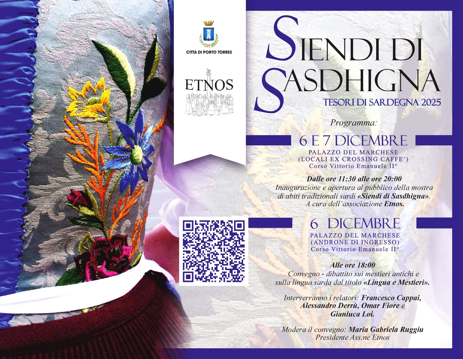 Nelle giornate di sabato 6 e domenica 7 dicembre 2025 sarà visitabile, presso il locale del Palazzo del Marchese sito al n° 57 del Corso Vittorio Emanuele II (ex Crossing’s Cafè), una mostra di abiti tradizionali sardi provenienti da diversi centri dell’isola, corredati da oggettistica originale di epoca tardo ottocentesca-inizio novecentesca. La mostra aprirà in entrambi i giorni alle ore 11:30 e sarà visitabile, con orario continuato ed ingresso libero, sino alle ore 20:00.