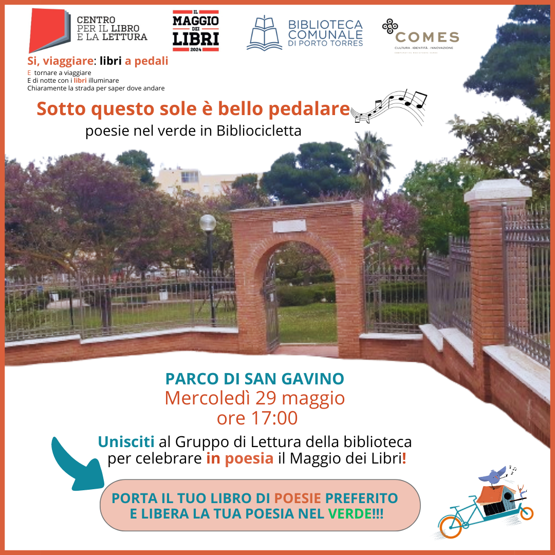 Per celebrare il Maggio dei Libri il Gruppo di lettura parte con la bibliocicletta verso il Parco di San Gavino per una lettura pubblica e collettiva nel verde di poesie. L’incontro è aperto a tutti coloro che amino la poesia e vogliano liberare i versi di poeti e poetesse nei cieli di Porto Torres per far scoprire la capacità che le parole hanno di emozionare e raccontare l’essere umano.