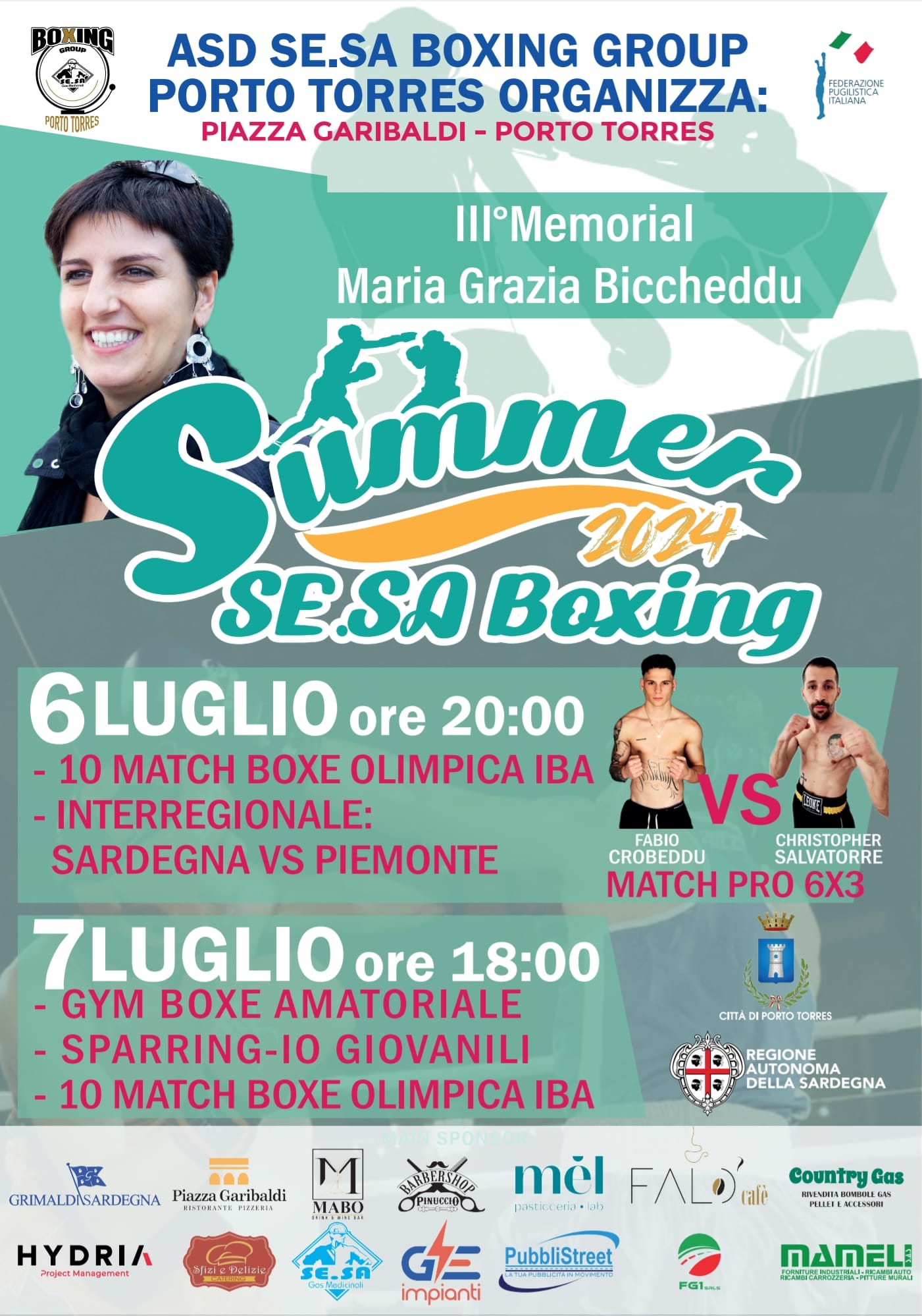 Evento Sportivo pugilistico, dedicato al ricordo di Maria Grazia Biccheddu. Due giorni di sport musica e spettacolo, dove vedremo una sfida tra Sardegna e Piemonte, esibizioni di Boxe Giovanile, Gare Gym Boxe Amatoriale e super big Match PRO BOXING. Ci sarà una gradita sorpresa che farà da contorno alla manifestazione sportiva,
