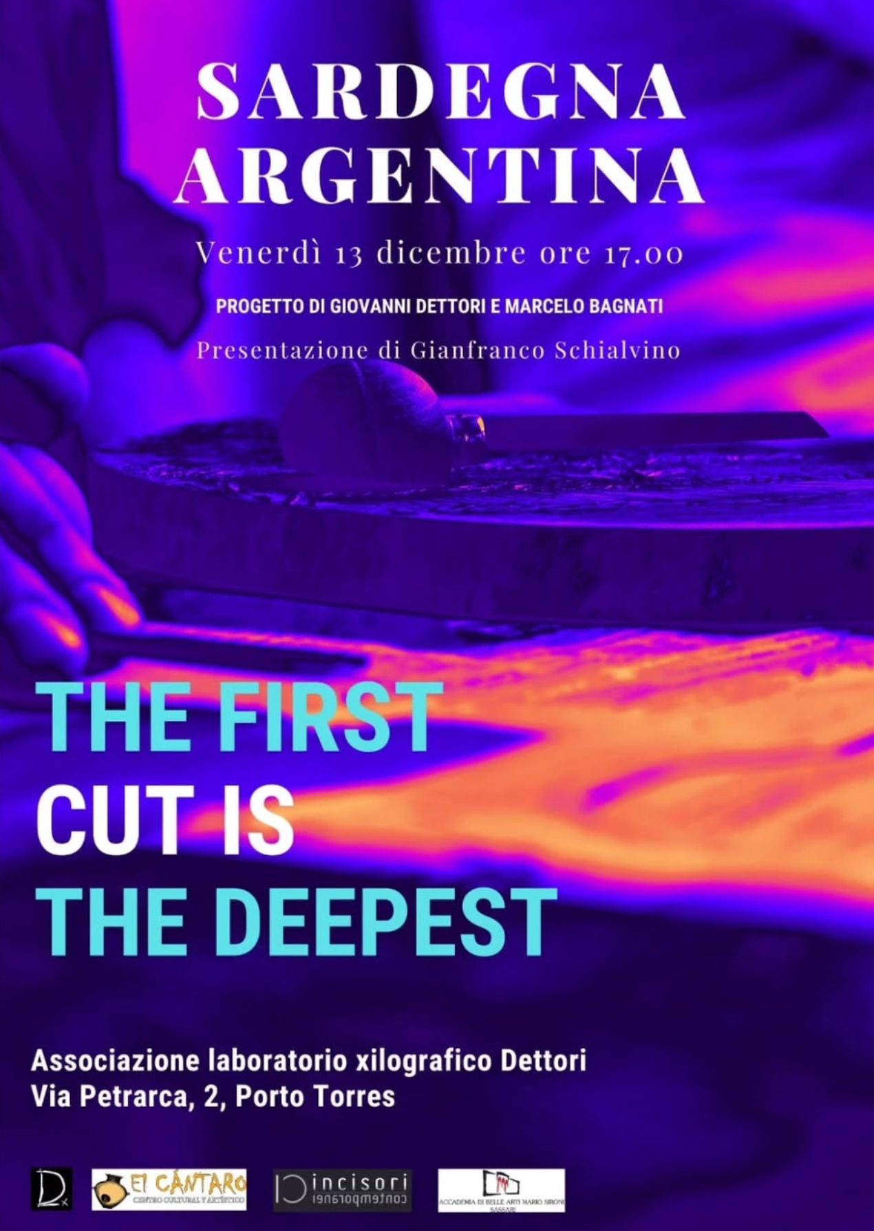 Venerdì 13 dicembre, presso il laboratorio xilografico di Giovanni Dettori, sarà inaugurata la mostra The First cut Is the deepest: Sardegna-Argentina che vede la partecipazione di allievi e docenti dell' Accademia di belle arti Mario Sironi di Sassari e trenta artisti Argentini del Centro Culturale Y Artistico El Cantaro di Buenos Aires.