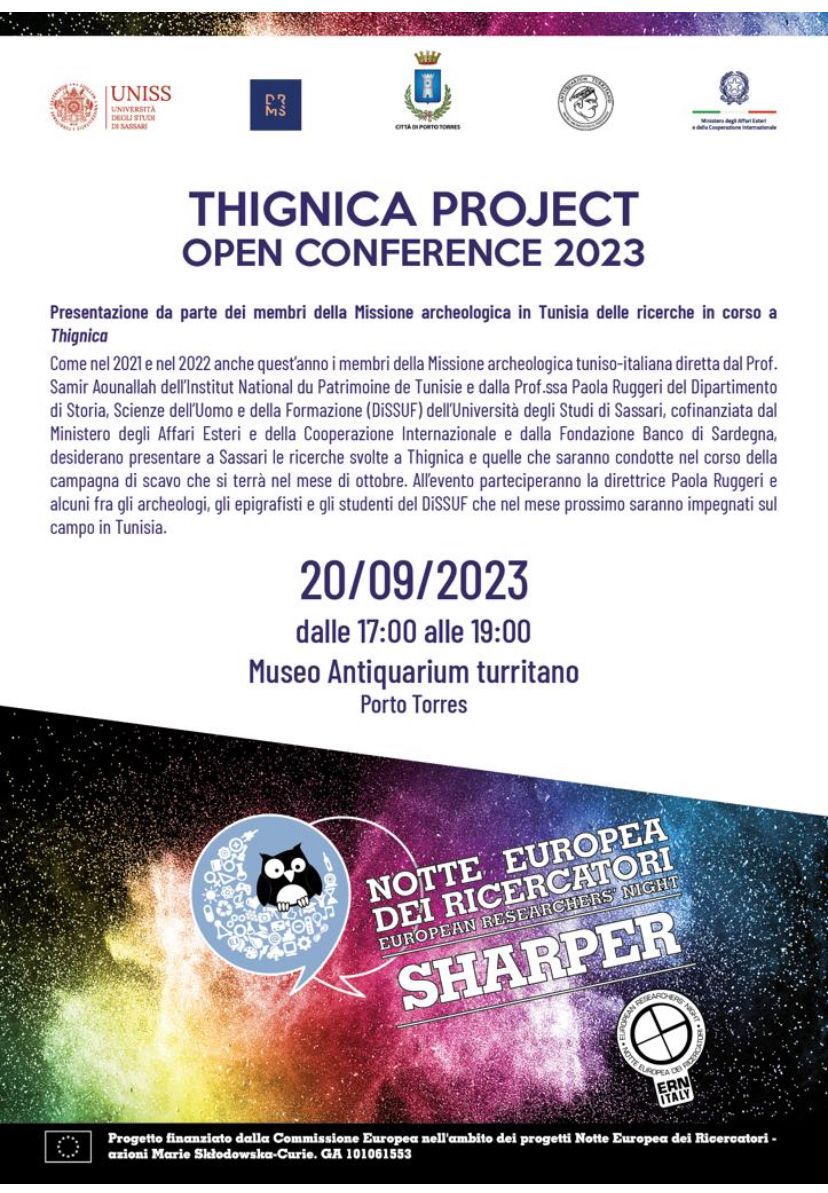 Il gruppo di ricerca del Thignica project diretto dalla Prof.ssa Paola Ruggeri (DiSSUF - UNISS), presso la sala dell'Antiquarium Turritano presenterà Thignica project open conference 2023, un pre-evento della manifestazione Sharper - Notte europea dei ricercatori 2023 (https://www.sharper-night.it/) dedicato alla presentazione delle attività della missione archeologico-epigrafica UNISS a Thignica (Aïn Tounga, governatorato di Beja, Tunisia).
