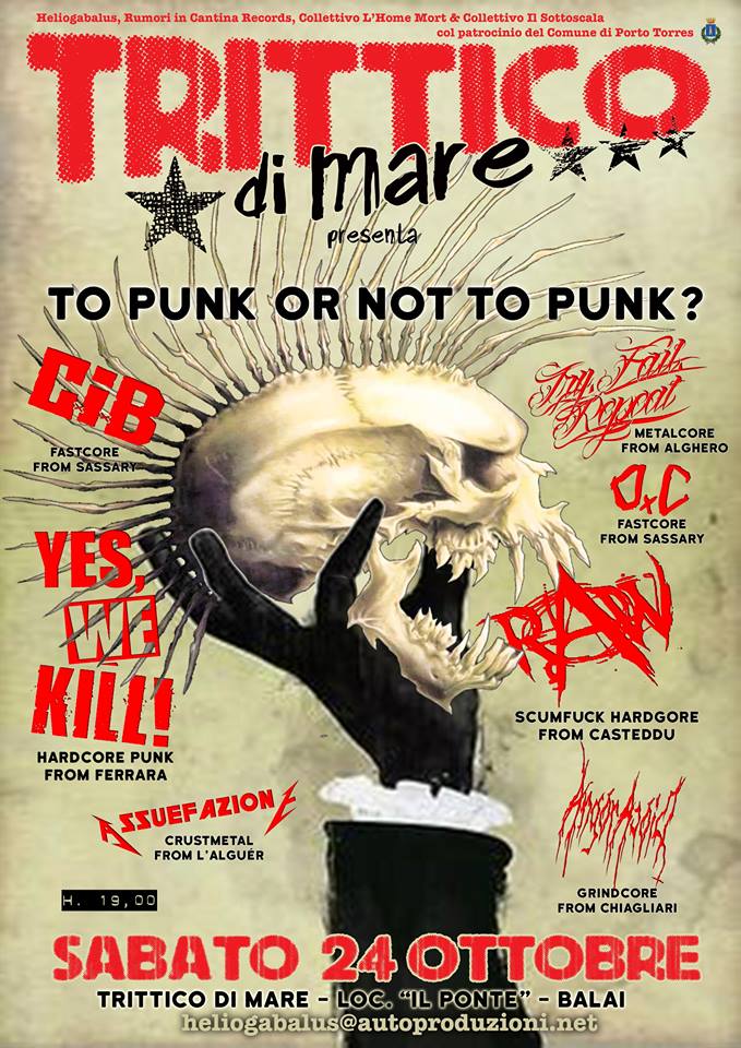 Rumori in Cantina Records, Heliogabalus autoproduzioni, insieme al Collettivo punx algherese "L'Home Mort", il Collettivo punx sassarese "Il Sottoscala" sono orgogliosi di presentare la seconda delle due date del minitour sardo degli YES, WE KILL, storica formazione ferrarese. Ad affiancarli nel live saranno presenti i RAW (punk hc da Cagliari) di grande impatto scenico, una delle formazioni più estreme dell'Isola sarda. Come bands opening: C.I.B (fastcore da Sassari); ANGORACOID (grindcore da Cagliari) ; OxC (fastcore da Sassari); TRY - FAIL - REPEAT (metalcore da Alghero); ASSUEFAZIONE (crust-metal da Alghero).