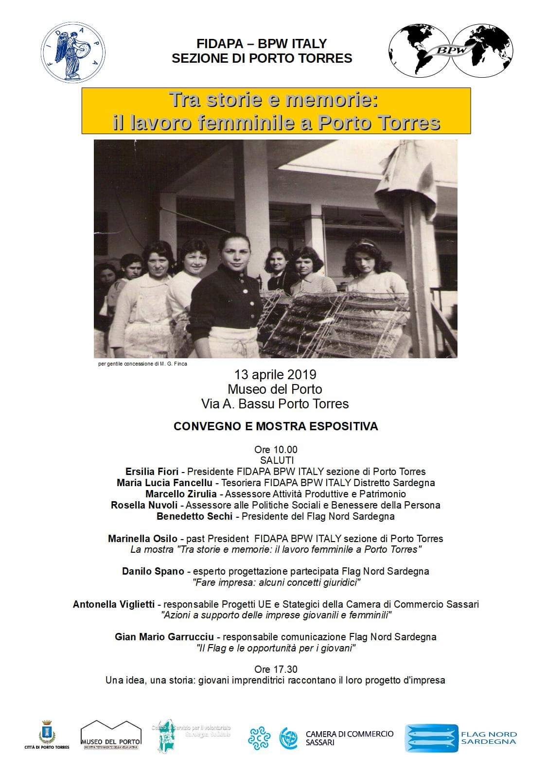 Sabato 13 aprile il Museo del Porto, a Porto Torres, ospita dalle ore 10 la manifestazione “Tra storie e memorie” organizzata dalla sezione turritana della FiDAPA - BPW ITALY. Un workshop, in collaborazione con il Comune di Porto Torres, la Camera di Commercio di Sassari e il Flag Nord Sardegna, che rientra nel tema internazionale del biennio 2017/2019 “Empowering Women to Realize Sustainable Development Goal” (aiutare le donne a raggiungere le finalità di sviluppo sostenibile), portato avanti da tutte le sezioni nazionali e internazionali della FIDAPA, i cui obiettivi sono definiti dall’Agenda 2030 dello sviluppo sostenibile. Un’occasione per valorizzare il lavoro femminile a Porto Torres, e illustrare le opportunità imprenditoriali, finanziarie e formative presenti nel territorio, che apre la manifestazione suddivisa tra mattina e sera. A seguire i saluti della tesoriera del Distretto Sardegna Maria Lucia Fancellu e della past president della sezione di Porto Torres Marinella Osilo.