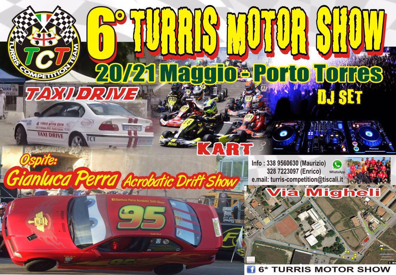 Ancora una volta i ragazzi del Turris Motor Show hanno confezionato uno spettacolo imperdibile che ogni anno richiama migliaia di appassionati e non solo da tutta la Sardegna. Si inizierà sabato 20 Maggio con l'esibizione dei potentissimi go kart privilegiando i piloti piu piccoli, con la presenza di stunt man e del tanto amato taxi drive, che permetterà di poter fare un giro su una vera macchina da Rally. Durante la notte del sabato si svolgerà il consueto spettacolo musicale.