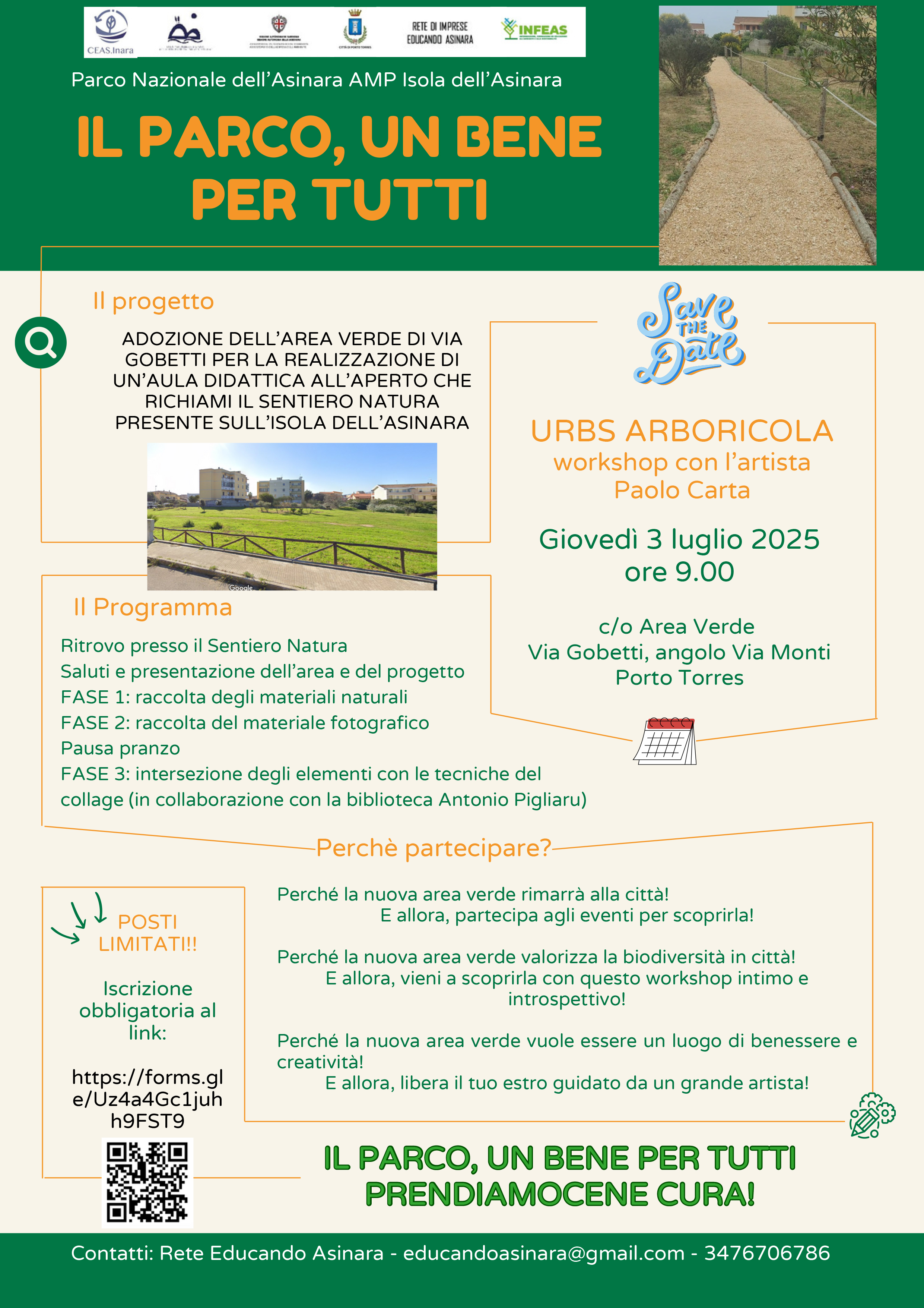 Questo giovedì, l’evento è dedicato ai giovani e agli adulti, che accompagnati dal Prof. Paolo Carta, i partecipanti avranno la possibilità di confrontarsi con il nuovo Sentiero Natura realizzato dal Parco Nazionale dell'Asinara in via Gobetti, a Porto Torres. La giornata si articolerà in tre fasi: un primo momento conoscitivo e di presentazione, la raccolta di materiale vegetale e fotografico ed infine la realizzazione di un collage con diverse tecniche, per mesciare insieme natura e ambiente urbano.