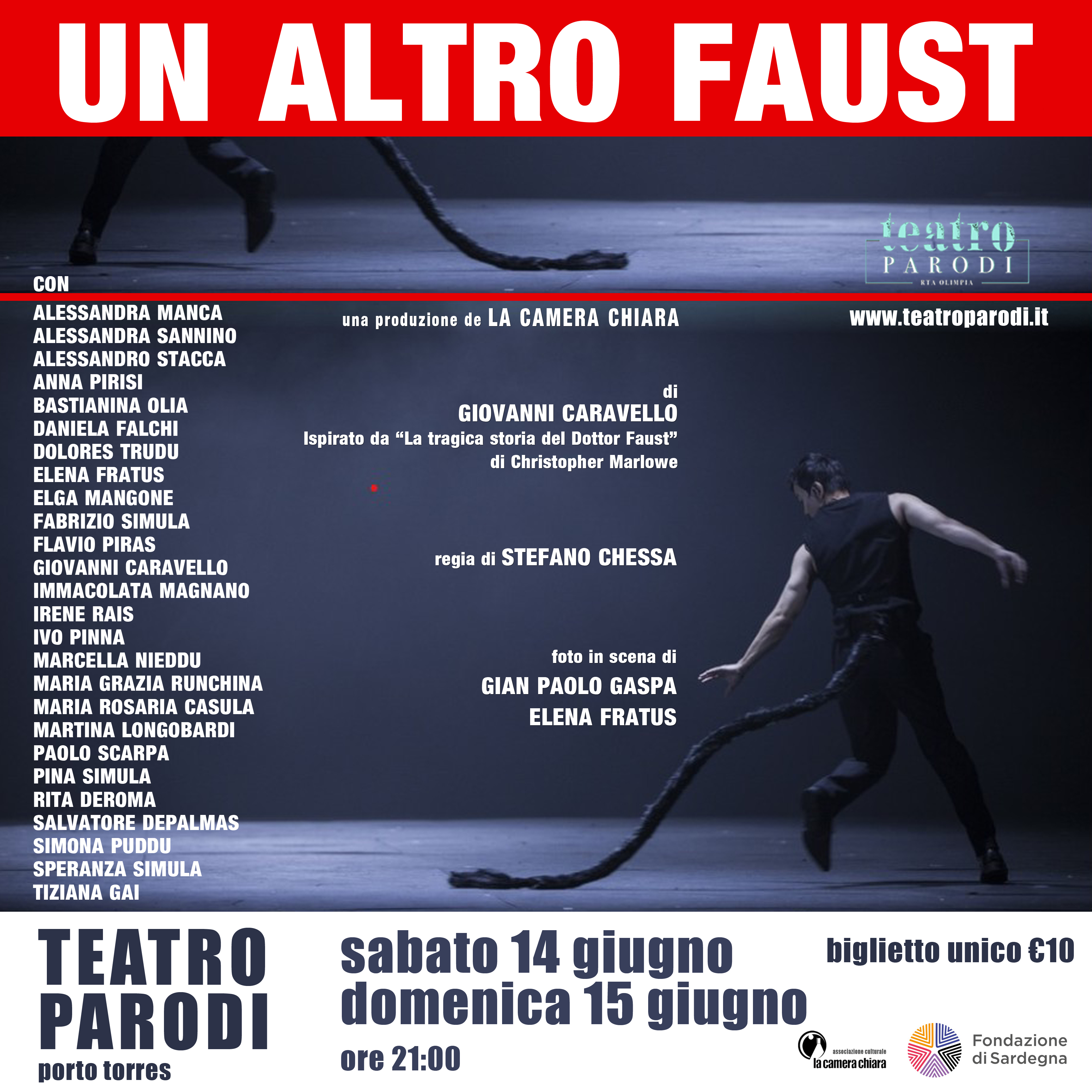Sabato 14 e Domenica 15 giugno l’associazione La camera chiara presenta al Teatro A. Parodi lo spettacolo “Un altro Faust”. Il testo è stato scritto da Giovanni Caravello ed è stato ispirato da “La tragica storia del Dottor Faust” di Christopher Marlowe. Regia di Stefano Chessa, aiuto regia di Elga Mangone. In scena: Daniela Falchi, Alessandra Sannino, Salvatore Depalmas, Bastianina Olia, Dolores Trudu, Flavio Piras, Ivo Pinna, Paolo Scarpa, Elga Mangone, Maria Rosaria Casula, Pina Simula, Martina Longobardi, Immacolata Magnano, Marcella Nieddu, Alessandro Stacca, Fabrizio Simula, Rita Deroma, Giovanni Caravello, Anna Pirisi, Tiziana Gai, Alessandra Manca, Speranza Simula, Irene Rais, Simona Puddu, Maria Grazia Runchina, Elena Fratus. Le foto in scena sono realizzate da Gian Paolo Gaspa ed Elena Fratus. L’allestimento tecnico è di Max Tanda.