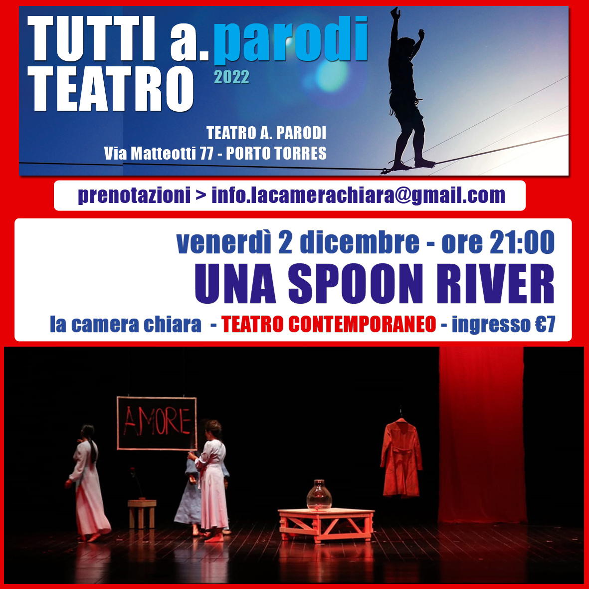 La compagnia La camera chiara porta in scena la produzione teatrale dal titolo: Una Spoon River, liberamente tratta dal capolavoro di Edgar Lee Masters. Si tratta del penultimo appuntamento della rassegna Tutti a Teatro 2022.