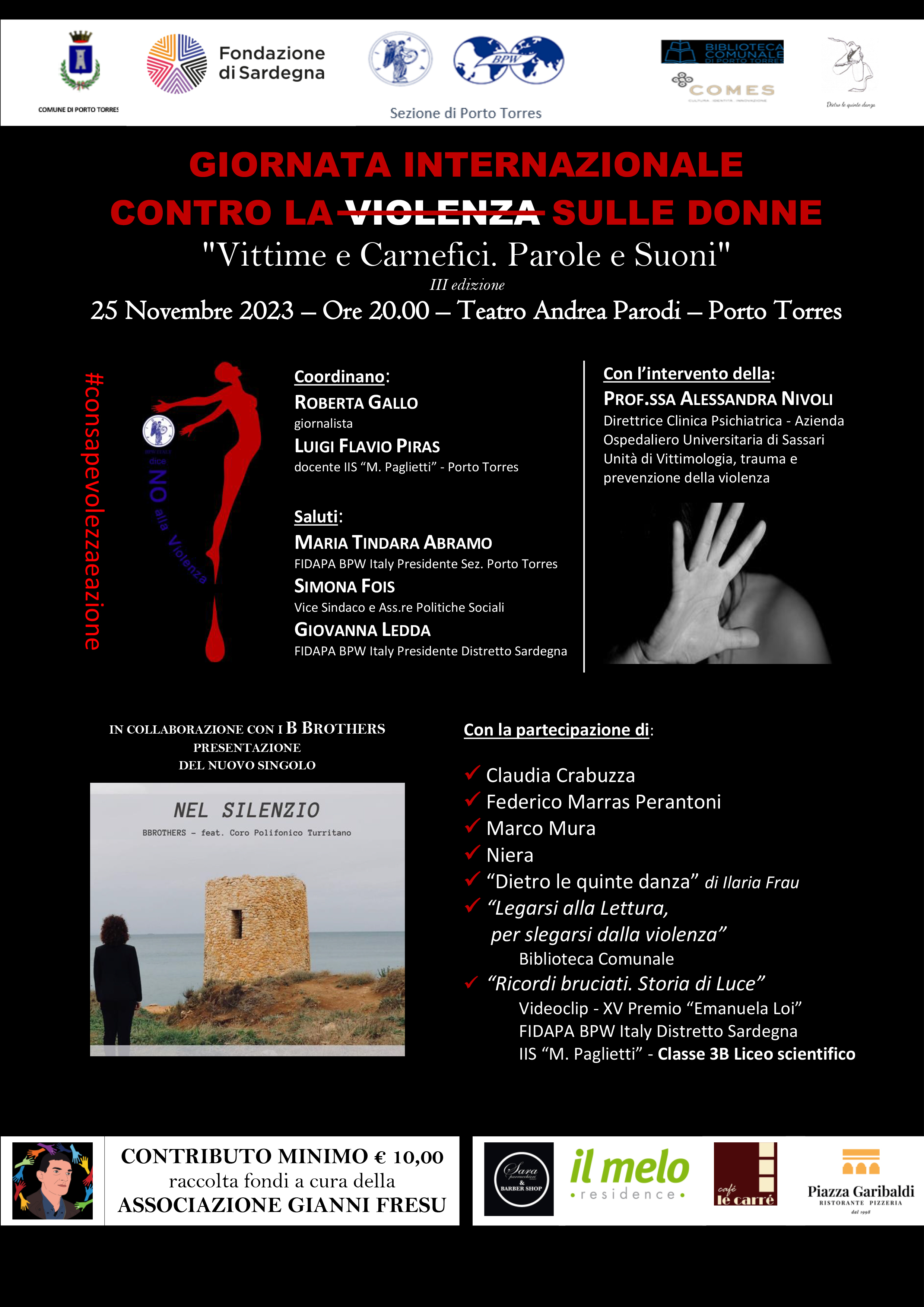 Per l’occasione la sezione locale della Fidapa BPW Italy, impegnata da sempre iniziative volte alla sensibilizzazione e all’informazione sui temi legati alla difesa dei diritti delle donne e al contrasto alla violenza di genere, con il patrocinio del Comune di Porto Torres e il sostegno della Fondazione di Sardegna, organizza per il terzo anno consecutivo l’evento “Vittime e Carnefici. Parole e Suoni”.
