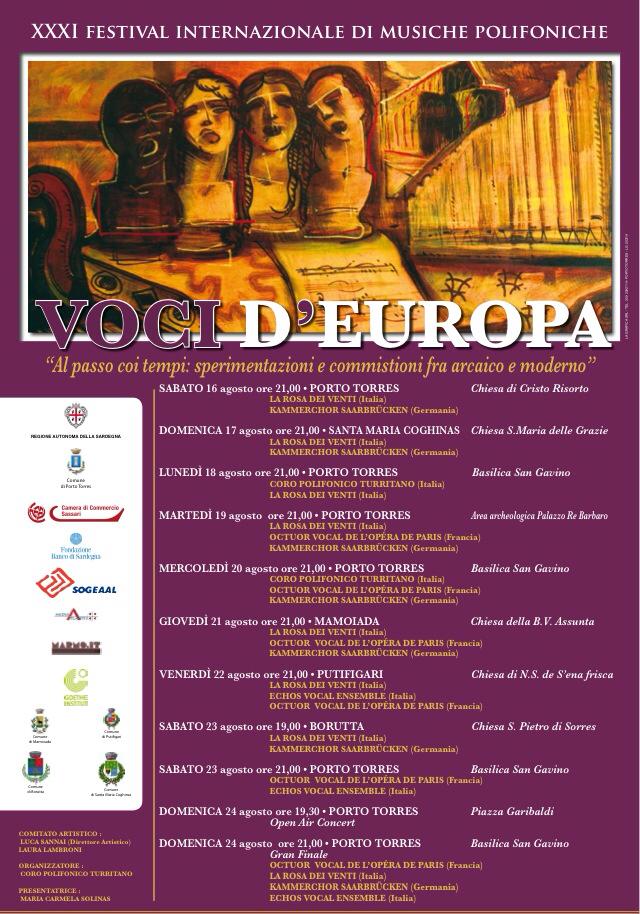 Il tour inizierà il 16 agosto a Porto Torres, nella Chiesa di Cristo Risorto. Domenica 17 tappa a Santa Maria Coghinas nella suggestiva cornice della Chiesa di Santa Maria delle Grazie. La manifestazione proseguirà con una sessione infrasettimanale a Porto Torres, con tappa lunedì alle 21 nella Basilica di San Gavino, location dove il festival ritornerà mercoledì 20 agosto. Due serate nelle quali ai cori ospiti si aggiungerà anche il Coro Polifonico Turritano. Tra le novità di quest'anno è senz'altro da segnalare per martedì 19 agosto la prima volta di Voci d'Europa nell'area archeologica Palazzo di Re Barbaro. Giovedì 21 agosto il Festival si sposta a Mamoiada nella Chiesa della Beata Vergine Assunta. Venerdì 22 a Putifigari nella Chiesa Nostra Signora de S'ena Frisca. Sabato 23 agosto doppio concerto: oltre a Porto Torres, il tour in giornata farà tappa a Borutta nella Chiesa di San Pietro di Sorres nell'ambito della manifestazione "La Bastida di Sorres". Domenica 24 agosto l’open air concert in Piazza Garibaldi e il gran finale nella Basilica di San Gavino con tutti i cori ospiti della 31^ edizione. Presenta i concerti Maria Carmela Solinas.