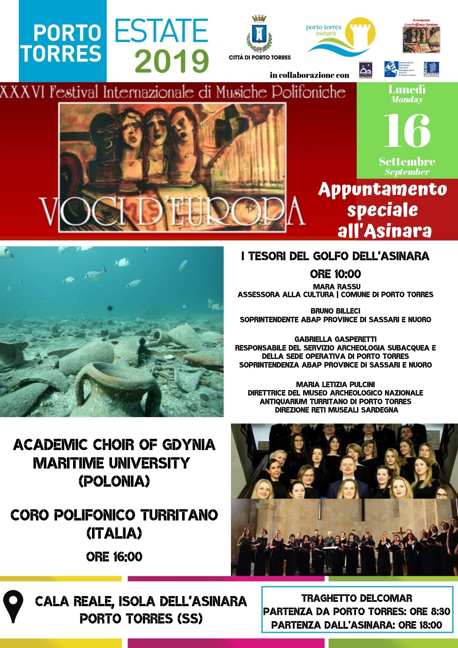 Un evento speciale nell'altra metà del territorio di Porto Torres, l'isola dell'Asinara. Il Festival Internazionale di Musiche Polifoniche "Voci d'Europa" approda lunedì 16 settembre sull'isola parco. Sarà una giornata dedicata alla cultura, con la conferenza promossa dal Comune di Porto Torres assieme alla Soprintendenza Abap per le Province di Sassari e Nuoro e al Museo Archeologico Nazionale Antiquarium Turritano. In programma tanta buona musica con il concerto del Coro Polifonico Turritano (Italia) e dell'Academic Choir Of Gdynia Maritime University (Polonia).