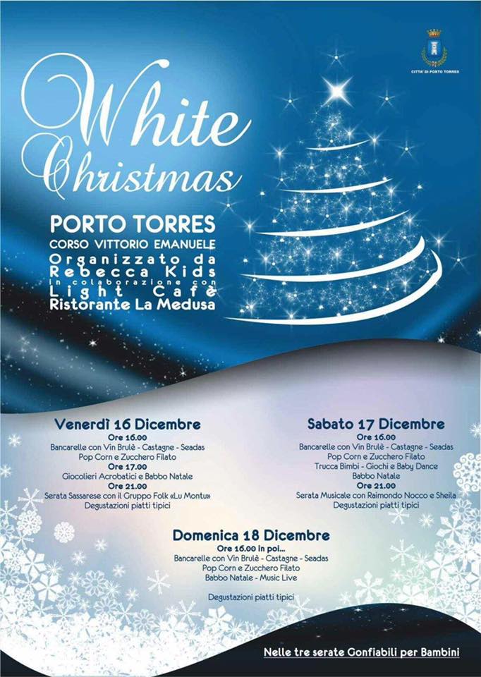 Da venerdì 16 a domenica 18 dicembre il Corso Vittorio Emanuele si anima con attrazioni per bambini, artisti, gonfiabili, giostrine, luci, musica e degustazioni di castagne, seadas e vin brûlé. L'evento patrocinato dal Comune di Porto Torres è organizzato da Rebecca Kids in collaborazione con Light Cafè e Ristorante La Medusa.