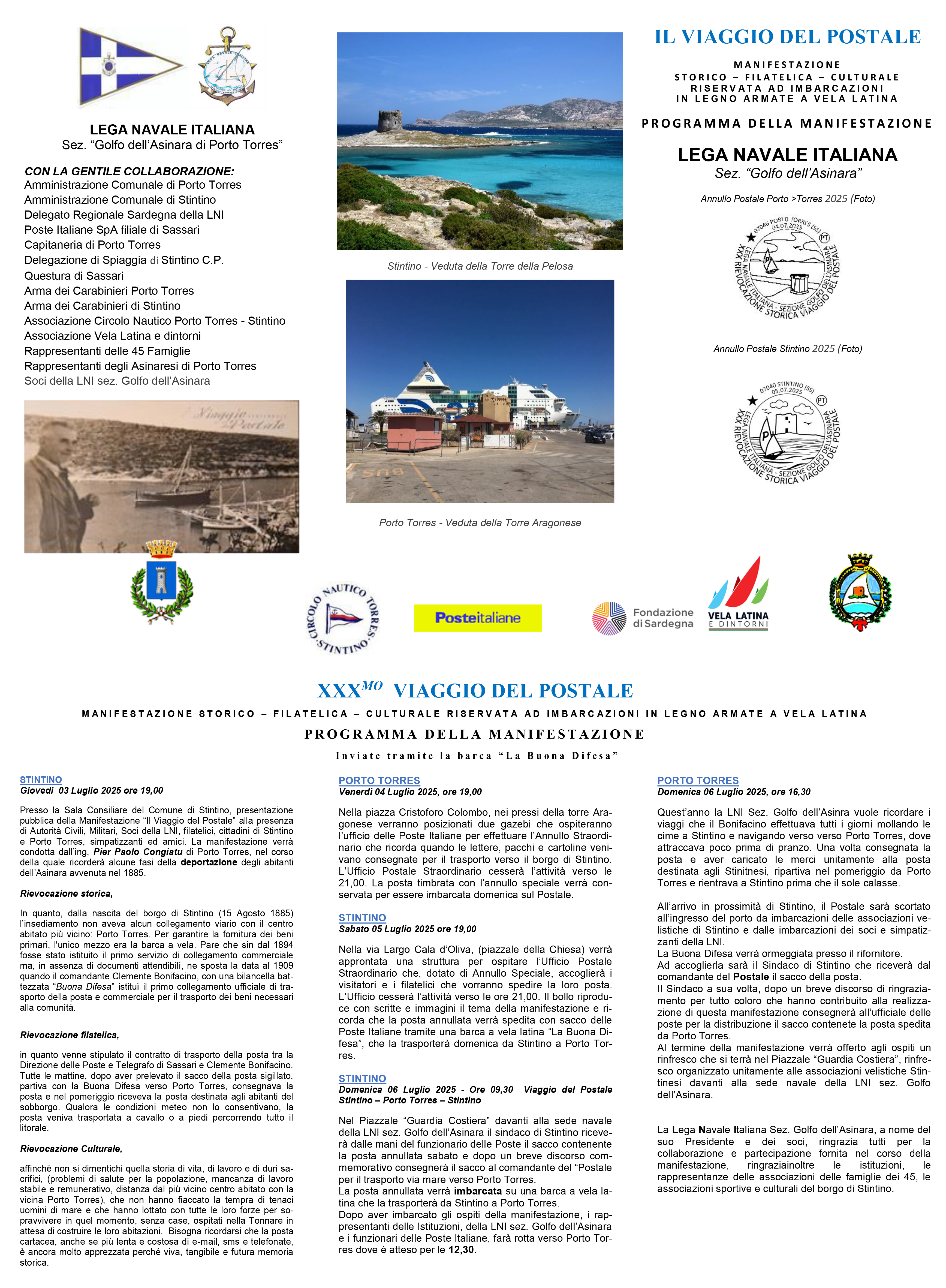 All'arrivo in prossimità di Stintino, il Postale sarà scortato all'ingresso del porto da imbarcazioni delle associazioni velistiche di Stintino e dalle imbarcazioni dei soci e simpatizzanti della LNI.
